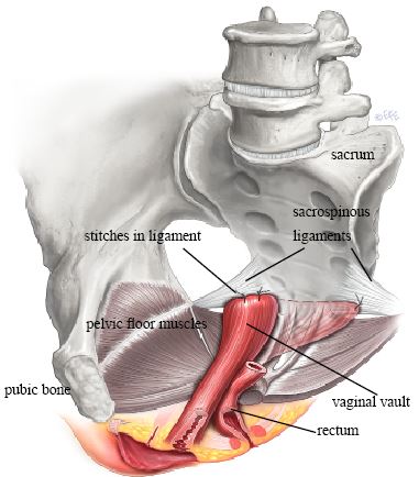 The vaginal apex is sutured to the sacrospinous ligament, a strong ligament deep in the pelvis. This is performed through a vaginal approach.