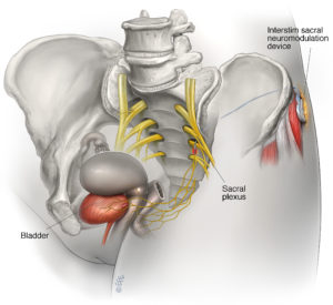 Sacral neuromodulation (InterStim therapy) involves the implantation of a small device that delivers mild electrical pulses to the sacral nerves, which control bladder and bowel function. It is used to treat chronic urinary retention, refractory overactive bladder symptoms, and fecal incontinence.